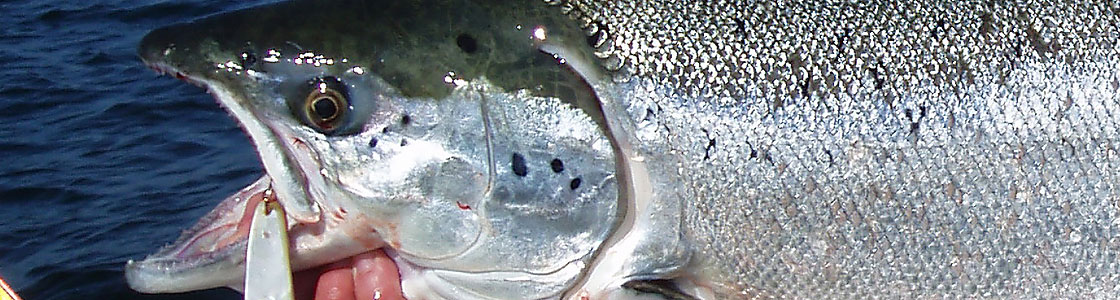 Lachs Nummer zwei hängt und diesmal drille ich. Es ist ein unglaublicher Anblick, wenn der Fisch hinter dem Boot in der Tiefe plötzlich Flanke zeigt um dann Sekunden später wie ein Pfeil durch die Wasseroberfläche zu brechen und einen Sprung hinlegt der einem das Blut in den Adern einfrieren lässt. Das ist Lachstrolling! Auch diesen Fisch landet André gekonnt und ich halte meinen ersten Lachs in Händen. Dieser konnte verständlicherweise dem österreichischen Perlmutt nicht widerstehen. Wir runden den Tag ab mit einem weiteren Lachs, der sich auf ca.40 Fuß Wassertiefe am Downrigger eine Perlmuttspange greift. Natürlich gehen hin und wieder auch Dorsche an den Haken. Diese setzten wir aber allesamt zurück. (O-Ton André….“Dies ist ein Lachsboot!“)